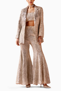 The Jacket is completed with detailed Mirrorwork and Beadwork Embroidery and scalloped edges. Style it with The bandeau is completed with detailed Mirrorwork and Beadwork Embroidery. Paired with The Sharara features a graceful and Wide-legged silhouette, along with Mirrorwork.