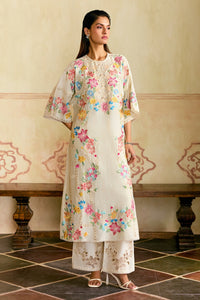 Featuring an ivory chanderi flared kurta adorned with mosaic threadwork and beadwork, paired with ivory chanderi sheer pants enhanced with delicate applique and intricate cutwork.
