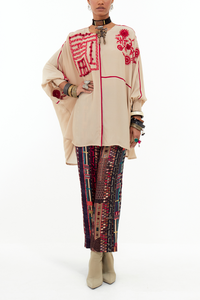 Featuring Ivory Multi Beyond Ken Mandala Shirt Set. Aseem Kapoor's Italian Crepe and Slub Satin ensemble in Ivory Multi. The embroidered solid shirt, featuring Aari embroidery and delightful tassels, is perfectly paired with Straight Pants. This Beyond Ken set combines an anti-fit silhouette with artistic details for a distinctive look.