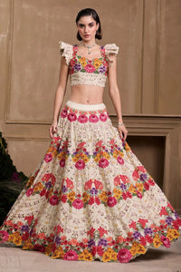 This stunning ensemble features an ivory Chanderi bustier adorned with multicolored 3D florals, intricate cutwork, and delicate beadwork, creating a dimensional and luxurious design. Paired with a matching ivory Chanderi lehenga, it showcases vibrant multicolored threadwork, beadwork florals, and detailed cutwork, offering a harmonious blend of traditional craftsmanship and contemporary style. Perfect for weddings or festive occasions, this set exudes elegance, sophistication, and a rich artistic flair.