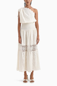 The ivory anglaise broderie one-shoulder dress from Notre Ame is handcrafted in soft cotton broderie anglaise. The midi dress features a tiered silhouette with scalloped neck and a smocked waist. The delicate embroidery makes it a summer perfect - minimal and sophisticated chic.