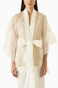 Every bit luxe and fabulous, this Ivory Organza Cape Top with Lace Details encapsulates the energy of a dreamy fit and will surely turn heads.
