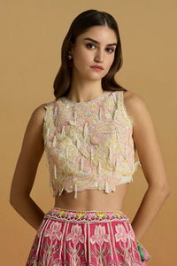 Featuring Ivory Paisley Applique and Beadwork Crop Top by Chandrima’s Amaryllis FW25 Collection. A refined ivory chanderi crop top adorned with intricate paisley cordwork, applique, and bead embellishments, blending traditional artistry with contemporary, statement-making elegance.