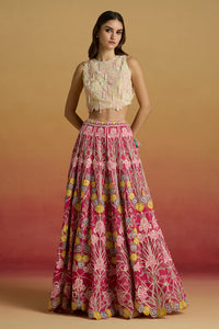 Ivory Paisley Applique Crop Top with Hot Pink Amaryllis Lehenga