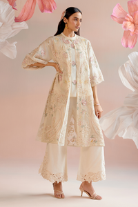 Introducing our exquisite ivory silk organza jacket, featuring intricate paisley threadwork, beadwork, and stunning 3D floral embroidery. The combination of textures and detailing adds depth and charm, making it ideal for festive celebrations.