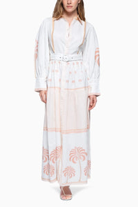The Robe Carmela in Ivory Palm Tree is a chic long-shirt dress. Featuring a button-down front that extends to the hem and long balloon sleeves with cuffed details, this elegant piece combines comfort and style, perfect for both lounging and effortless daytime wear.