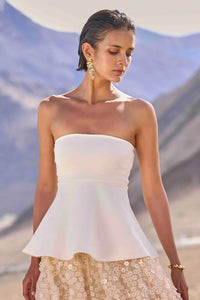This ivory strapless peplum top is crafted from organic knitted fabric, offering a soft yet structured feel. Designed with a sculpted fit-and-flare silhouette, it flatters the figure while maintaining a clean, modern aesthetic. Perfect for effortless elegance with a sustainable edge.