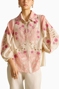 Featuring ivory & pink chanderi panelled applique, beadwork and cutwork shirt.