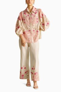 Featuring ivory & pink chanderi panelled applique, beadwork and cutwork shirts and pants.