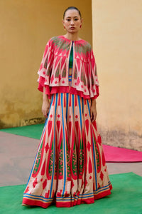 Featuring the Ivory Red Kilim Lehenga Set from Swati Vijaivargie’s Mauj Collection — a vibrant celebration of Rajasthan’s Kilim Dhurry weaves. Every color, shape, and print reflects the artistry of our skilled craftsmen. This statement set includes a one-shoulder habutai silk singlet with side zipper, a kali-style linen satin lehenga with cancan and lining, and a double-layered circular cape in habutai silk. Perfect for adding a burst of color and pattern to your festive season wardrobe.