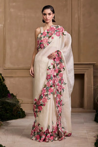 This exquisite ivory silk organza saree is adorned with delicate rose threadwork, intricate beadwork, and elegant cutwork, making it a timeless piece of art. The lightweight organza fabric drapes beautifully, creating an ethereal silhouette, while the rose motifs add a soft, romantic touch. The bead detailing subtly enhances the design, lending a hint of sparkle that catches the light with every movement. Paired with a plain blouse piece, this saree offers a perfect balance of elegance and simplicity, ideal for weddings, receptions, or special occasions where understated glamour speaks volumes.