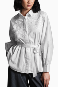 Ivory Rose Shirt – a timeless elegance with a waist- belt for a subtle peplum effect. Adorned with delicate rose patchwork, it's crafted to make you look ethereal in white. The hidden button placket adds finesse for a refined appearance. Elevate your style effortlessly.