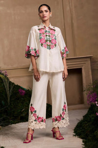 This elegant ivory Chanderi ensemble features a shirt and matching pants, both adorned with intricate rose threadwork and beadwork. The shirt showcases delicate floral embroidery, with shimmering beads enhancing the design, creating a refined and sophisticated look. Paired with the coordinating pants, which mirror the same rose threadwork and bead detailing, this set offers a harmonious and graceful silhouette.