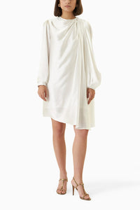 Ivory satin midi dress in an architectural shape. Pleats on the wearer's left shoulder and down back. Dolman balloon sleeve. Zip closure at the back. The dress is lined in the front and back.