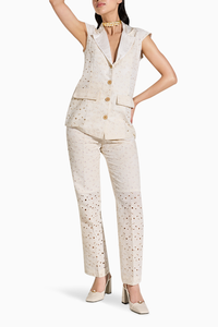 Featuring a schiffli front open blazer top with wooden buttons and straight elasticated pants.