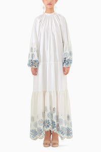 Featuring Ivory Schiffli Tier Dress by Nikasha from Under The Banyan Tree Collection. Made from 100% cotton poplin, this dress showcases exquisite mirror work and delicate cutwork along the hemline, offering a refined, timeless silhouette with a touch of artisanal charm.