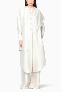 Featuring Ivory Silk Maxi Scarf Set by 431-88 Shweta Kapur from The Popsicle Collection. Radiate elegance with this stylish comes with a front panel extending into a scarf that drapes around your neck. Maxi Scarf Set features a relaxed fit scarf dress with wide trousers. Crafted in silk fabric, this dress is made in a mid calf length and has full sleeves. Comes with matching trousers for a coordinated look.