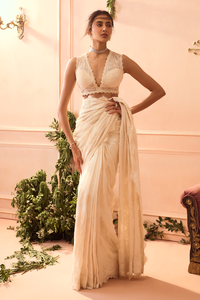 Featuring Ivory Silk Organza Saree with Blouse by Rose Room from it's Hue De Paradise Collection. This saree sounds exquisite and elegant! The light and airy texture of silk organza combined with the classic ivory color exudes a timeless charm. Depending on the occasion and your personal style. Crafted from matching chiffon fabric, the blouse features a complementary neckline style that enhances the overall elegance of the ensemble. It's a choice that's sure to make a sophisticated statement!