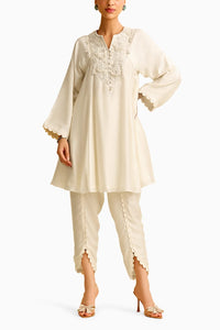 Featuring Ivory Silk Short Kurta with Tulip Pant by Ridhi Mehra from Love Rosetta Collection. Embrace elegance with this ivory silk flared short kurta, paired with matching tulip pants. The refined fabric and graceful silhouette make it a perfect choice for sophisticated and timeless style.