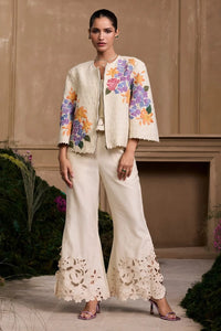 This ivory Chanderi ensemble combines timeless elegance with modern sophistication. The smocked bustier features a flattering, structured fit with intricate cutwork and ruffle detailing, offering both comfort and style. Paired with a short jacket adorned with delicate hydrangea floral appliqué and elegant beadwork, this outfit exudes luxury and depth, perfect for festive occasions, weddings, or formal events. Completing the look is the ivory smocked top, designed with a textured pattern that adds shape and grace, making it versatile for both casual and formal settings.