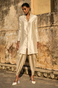Band collar ivory longline top with a gold zipper and paperclip puller in the front. V neck and full sleeves. Satin twill weave fabric. Paired with a draped and cowled dhoti inspired pant in shimmering drapey light gold fabric. Elasticated at the waist. Relaxed fit.
