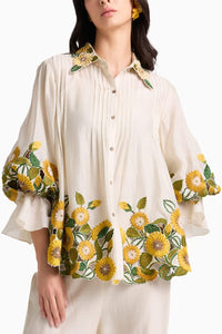 Dive into a realm of ethereal beauty with this ivory Chanderi pleated shirt by Chandrima's Florens collection. Meticulously adorned with sunflower threadwork and beadwork. The pleated detailing adds a touch of refinement to the shirt, enhancing its texture and creating a sense of movement.