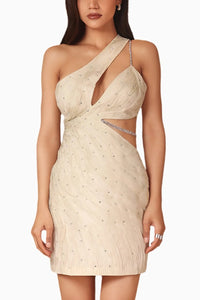 Showcasing Shriya Som's unique cut-out pattern bodycon dress from the Chrysalis Collection, meticulously crafted with intricate texturing techniques and adorned with shimmering crystals for a strikingly elegant finish.