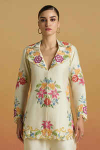 Featuring Ivory Threadwork and Beadwork Flared Jacket by Chandrima's Amaryllis FW25 Collection. This ivory Chanderi jacket is beautifully crafted with intricate floral threadwork and delicate beadwork, offering a graceful, contemporary silhouette perfect for festive and elegant occasions.