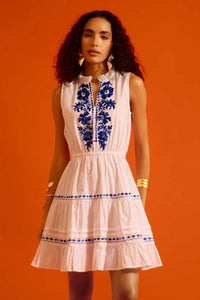 Featuring the Ivory Tier Mini Dress with Indigo Botanica Thread Embroidery, a relaxed-fit silhouette crafted from cotton. Accented with indigo botanical embroidery and soft tiered layers, it offers a breezy, elegant look with a touch of artisanal charm.