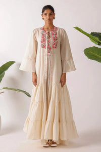 Featuring the Ivory Tier Pomegranate Overgarment by Nikasha from its Pomegranate Collection. This elegant 100% cotton tiered overgarment showcases delicate pomegranate print ribbon embroidery, offering a refined and graceful layering piece with artisanal charm.
