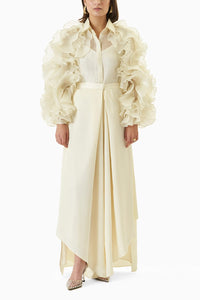 Every bit luxe and fabulous, this Ivory Ruffle Tousle and Juliet coord set encapsulates the energy of a dreamy fit and will surely turn heads. Top has ruffled sleevs and paired with a draped skirt.