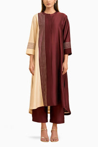 This Maroon & Ivory color-blocked long kurta with a high-low hemline offers a sophisticated design, featuring elegant vertical lines embroidery on the front panel and sleeves. The sleek band collar with a concealed placket and long sleeves add a modern, polished touch. Side slits ensure ease of movement, while the ankle-length straight-fit pants complete the ensemble, creating a refined and stylish look that is perfect for both formal and semi-formal occasions.