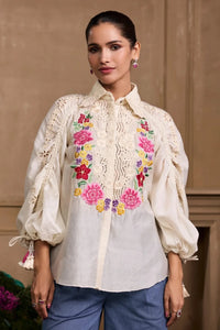 This ivory Chanderi shirt features intricate floral threadwork and beadwork, adding elegance and texture to the design. The gathered tie-up raglan sleeves offer a stylish, contemporary twist, while the lightweight fabric ensures comfort and fluidity. Perfect for casual or semi-formal occasions, this shirt blends traditional craftsmanship with modern detailing for a chic, sophisticated look.