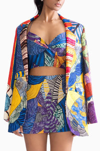 Featuring Ivy Blue Bustier with Sia Skort and Evie Multi Blazer by Saaksha & Kinni from Botanica Collection. Elevate your wadrobe the tribal print bustier with noodle straps for a bold, fashion-forward look. Pair it with the tribal print high-waist skirt for a coordinated, edgy style. Complete your outfit with the tribal print wide collared blazer, adding a sophisticated touch to your tribal-themed ensemble.