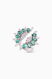 The Ivy Marquise Ring is a stunning display of symmetrical elegance and vibrant allure. Featuring a striking open-face design, this ring showcases green oval stones arranged in a half crescent shape, flanking two dazzling 0.50ct marquise-cut clear stones at the center. Set in solid 925 silver, this ring captures the essence of nature's beauty and sophistication, making it a perfect choice for those seeking a touch of luxurious distinction.