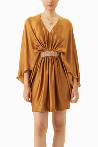 Featuring  Ivy Mustard Gold Dress by Kangana Trehan. Breathable and breathtaking at the same time, this satin-silk kaftan mini dress is every bit flattering. The intricate embellished details on the empire line make it the perfect ensemble for a transitional look.