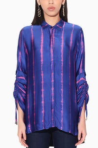 This hand-done shibori shirt combines artistry and craftsmanship, with a striking shibori pattern that creates a unique design. The shirt is finished with a pleated back panel, adding movement and texture for a stylish, contemporary silhouette.