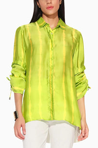 The Ivy Shibori Striped Shirt showcases exquisite hand-done Shibori craftsmanship, complemented by a delicate micro-pleated back for added texture and subtle sophistication.