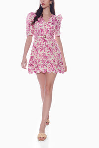 Featuring all over classic toile print fitted waistline with A-line dress with short puff sleeves and our signature scalloped detailing, this dress is a no brainer. Tailored in toile linen print, buttoned down centre front, invisible zip closure at center back and buckled belt adds definition & interest.