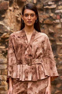 This elegant cape-inspired top is crafted from rich tonal coffee-colored floral jacquard fabric with a unique tie-dye effect. Featuring a shawl collar, inverted placket, and kimono sleeves, it combines timeless style with modern flair. The adjustable belt with a tortoise shell-finished buckle adds a chic closure, while soft hand smocking at the back creates a flattering shape for a beautifully tailored fit.