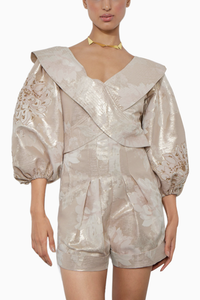 Rose fold jacquard romper with statement sleeves.