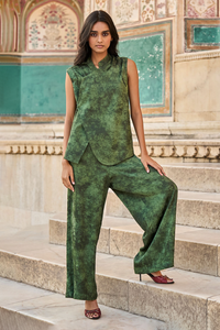Waistcoat inspired sleeveless, mandarin collar top in rich tonal green floral jacquard fabric. Side button detailing. Highlight black contrast hand running stitch on the shoulders. Concealed snap button closures. Garment is fully lined.