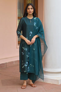 The Jade Appliqué Kurta Set features a refined combination of appliqué blooms and intricate thread detailing across the kurta. Coordinated with matching pants and a dupatta embellished with complementary floral motifs, this ensemble presents an elegant and effortlessly polished look.