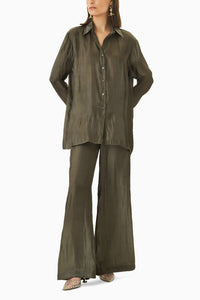 This metallic green coord set exudes modern sophistication with its sleek, shimmering finish. Perfect for making a bold statement, it offers a stylish and coordinated look for any occasion.