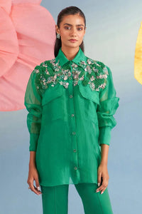 In a timeless jade green, the Lily Shirt set features a sheer silk organza shirt layered over a smooth imported crepe inner. Embellished with delicate dori work, lustrous pearls, and 3D floral embroidery, it blends traditional craftsmanship with contemporary elegance. Effortlessly polished, it’s a versatile choice for elevated daywear and graceful evenings.