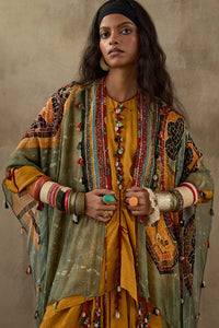 Featuring the Jade Mural Veni Dupatta Jacket by Aseem Kapoor from the Mural Collection. This jacket features intricate embroidery, lace, and tribal tassel details, enhanced by resham thread, beads, and highlighting. Designed as a free-sized dupatta jacket without armholes, it offers an anti-fit silhouette. *Slight variation in print may occur.*
