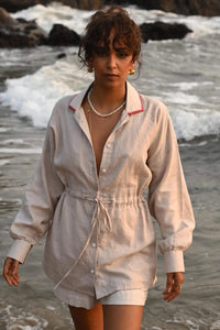 Introducing the Jade String Shirt, a stylish collar shirt featuring a front button-down design. This shirt includes a unique string tie-up around the waist for a flattering silhouette, complemented by beautiful embroidery detail on the collar. Perfect for adding a chic touch to any outfit!