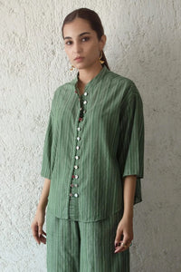The Butterfly Blouse is a relaxed cropped shirt designed for effortless style and comfort. Crafted from breathable handwoven cotton, it offers a lightweight feel perfect for everyday wear. The jade stripe pattern adds a subtle touch of elegance, while the drop shoulder and half sleeves enhance its relaxed silhouette. Featuring a classic button-down front, this versatile piece can be styled as a standalone top or layered for a more dynamic look. Designed in a free size, it comfortably fits up to a 39-inch (99 cm) chest.