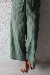 The Side Pocket Pajamas Jade offers a perfect blend of comfort and functionality. Crafted from fine handwoven cotton, these relaxed straight-leg pajamas provide breathability and ease of movement. The side zip and adjustable drawstring waist ensure a secure and customized fit, while the side pockets add a practical touch. Designed for effortless wear, these pajamas are a versatile addition to any wardrobe, whether paired with a casual blouse or a cozy top for lounging in style.
