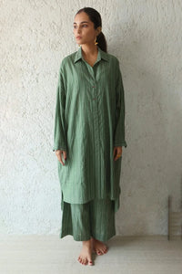 The Tailcoat Shift is a long, oversized shirt style crafted from fine, soft handwoven cotton. Designed for effortless sophistication, it drapes beautifully while ensuring all-day comfort. The jade stripe pattern adds a timeless charm, complemented by a classic shirt collar for a polished touch. Full cuffed sleeves enhance its structured appeal, while functional side pockets offer practicality. Versatile and easy to style, this piece can be worn as a dress or layered over trousers for a relaxed yet refined look.